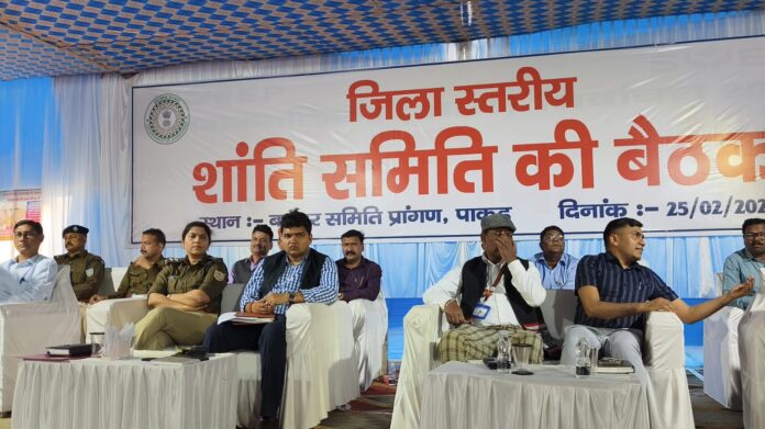 पाकुड़ अपडेट : आगामी होली, ईद एवं रामनवमी पर्व को लेकर जिला स्तरीय बाजार समिति के प्रांगण में शांति समिति की बैठक आयोजित किया गया जिसमें जिले के उपायुक्त मनीष कुमार, पुलिस अधीक्षक निधि द्विवेदी सहित कई अधिकारी, बीडीओ, सीओ एवं सभी थाना के प्रभारी मौजूद थे। बैठक में पर्व के दौरान कड़ी सुरक्षा बढ़ती जाएगी, सारा दिन नो एंट्री लागू रहेगी, डीजे पर प्रतिबंध एवं अवैध नशा पर अंकुश रहेगी तथा सोशल मीडिया पर पैनी नजर रहेगी। वही पुलिस अधीक्षक ने बताया कि वर्षों से चले आ रहे शांतिपूर्ण माहौल को बनाए रखना हम सबकी जिम्मेवारी है, उन्होंने कहा कि बच्चा चोर के नाम पर कोई भी कानून हाथ में नहीं लेगा, सक होने पर तुरंत पुलिस को सूचना देंगे। उपायुक्त ने कहा कि आगामी पर्व को लेकर जिला प्रशासन पूरी तरह से तैयार हैऔर अफवा फैलाने वाले पर कड़ी कार्यवाही की जायेगी। उन्होंने समाज के हर तबके के लोगों से आग्रह किया कि शांतिपूर्वक माहौल बनाए रखने में सभी प्रशासन का सहयोग करें। डीसी एवं एसपी ने जिलेवासियों को आपसी प्रेम और हर्षौल्लाश के साथ पर्व मनाने का संदेश दिया।