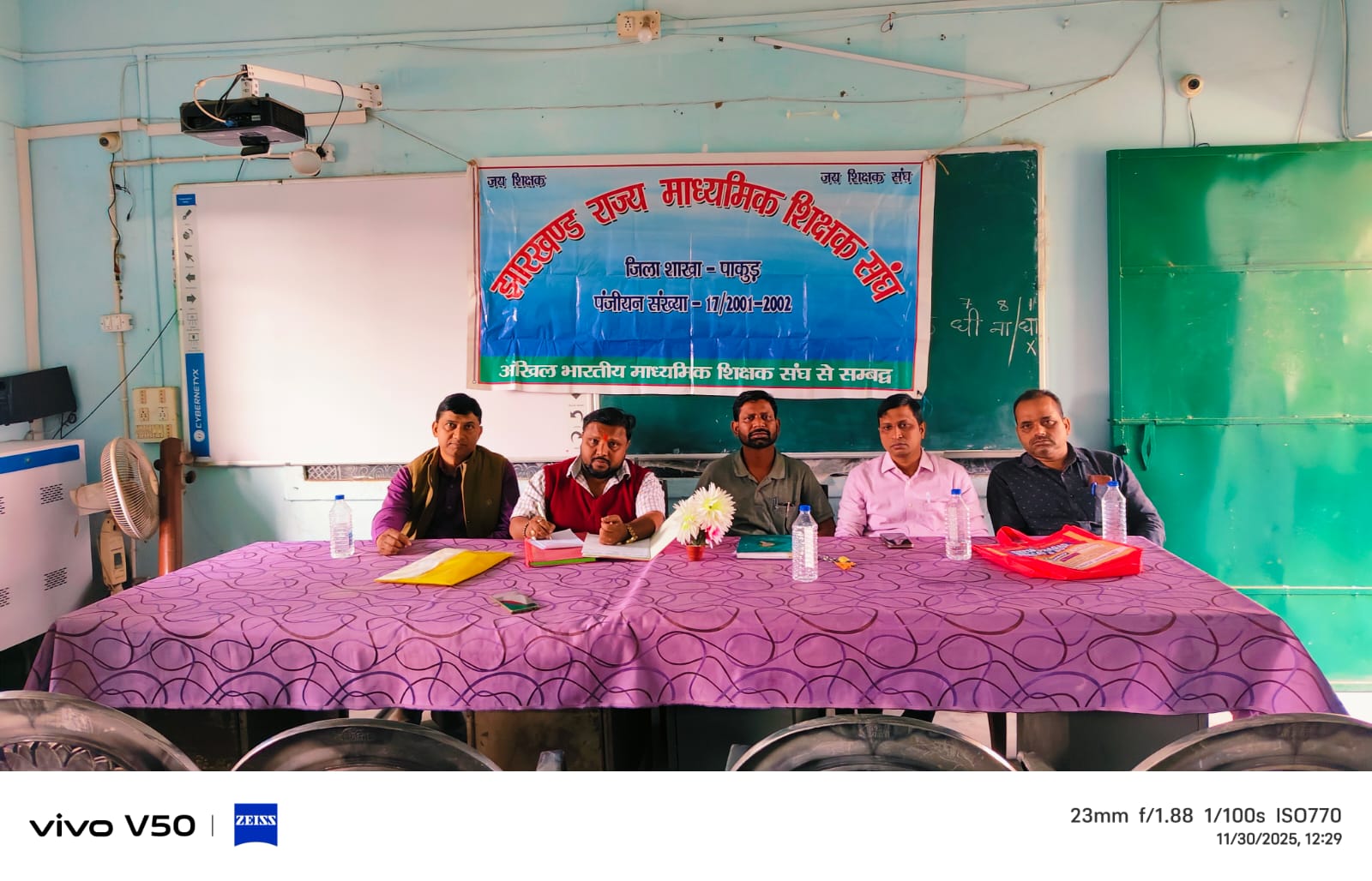 पाकुड़ अपडेट: रविवार को रानी ज्योतिर्मयी बालिका उच्च विद्यालय के प्रांगण में झारखण्ड राज्य माध्यमिक शिक्षक संघ पाकुड़ का बैठक संघ के अध्यक्ष अन्दरियस हेमब्रम की अध्यक्षता में संपन्न हुई। इस बैठक में मुख्य रुप से जिले में आगामी वर्ष 2026 में होने वाली मैट्रिक परीक्षा की तैयारी को लेकर संघ के पदाधिकारियों एवं सभी शिक्षकों ने गंभीरता से चर्चा किया ताकि ज़िला का परिणाम और बेहतर हो तथा अगले सत्र 2026-2027 का शैक्षणिक केलेन्डर जारी करने पर भी चर्चा की गयी |जिले के सभी कर्मचारियों का स्वस्थ्य बीमा कार्ड उयलब्ध हो इस पर विशेष चर्चा हुई साथ ही कुछ शिक्षकों और शिक्षकेत्तर कर्मचारियों का समस्या को सुना गया इसके निदान हेतु संघ के पदाधिकारी अपने विभाग से वार्तालाप भी करेंगे। सितम्बर माह में प्रतिभा सम्मान सामारोह सह शैक्षिक संगठन कार्यक्रम संपन्न हुआ था उसी का आय और व्यय की समीक्षा भी की गयी | बैठक में मुख्य रुप से संघ के ज़िला सचिव विजय कुमार भंडारी एवं संयुक्त सचिव हिफजूर रहमान, हिरणपुर प्रखंड के अध्यक्ष रुपेश कुमार एवं सचिव कयूम अंसारी उपस्थित रहे |