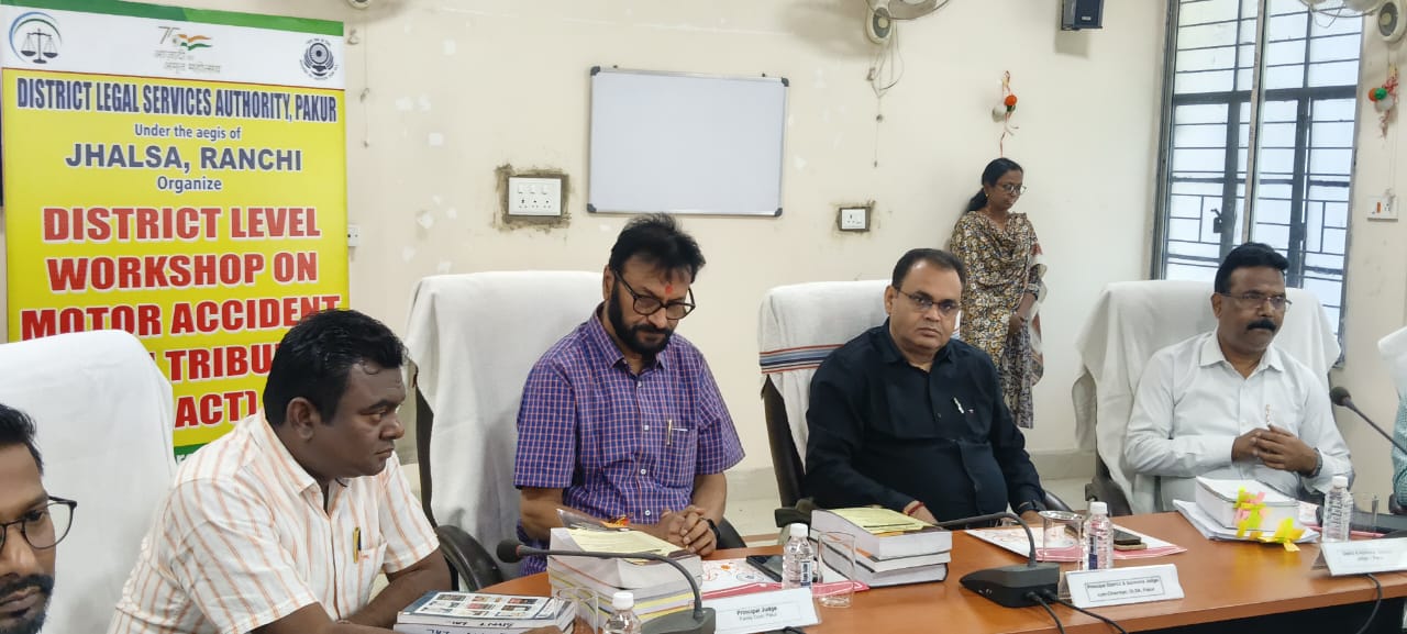 पाकुड़ अपडेट : झालसा रांची के निर्देशानुसार जिला विधिक सेवा प्राधिकार पाकुड़ के तत्वाधान में प्रधान जिला एवं सत्र न्यायधीश सह अध्यक्ष जिला विधिक सेवा प्राधिकार पाकुड़ दिवाकर पांडे की अध्यक्षता में पाकुड़ व्यवहार न्यायालय के कॉन्फ्रेंस हॉल में मोटर दुर्घटना दावा न्यायाधिकरण (एमसीटी) पर जिला स्तरीय कार्यशाला का आयोजन किया गया। उक्त कार्यक्रम का उद्घाटन प्रधान जिला एवं सत्र न्यायधीश सह अध्यक्ष जिला विधिक सेवा प्राधिकार पाकुड़ दिवाकर पांडे प्रधान न्यायाधीश कुटुंब न्यायालय रजनीकांत पाठक, अपर सत्र न्यायधीश प्रथम कुमार क्रांति प्रसाद मुख्य न्यायिक दंडाधिकारी संजीत कुमार चंद्र, डीएसपी जितेंद्र कुमार लीगल एड डिफेंस कॉन्सिल सिस्टम के चीफ सुबोध कुमार दफादार, अनुमंडल पदाधिकारी साइमन मरांडी,पैनल अधिवक्ता सिद्धार्थ शंकर ने संयुक्त रूप से दीप प्रज्वलित कर की।