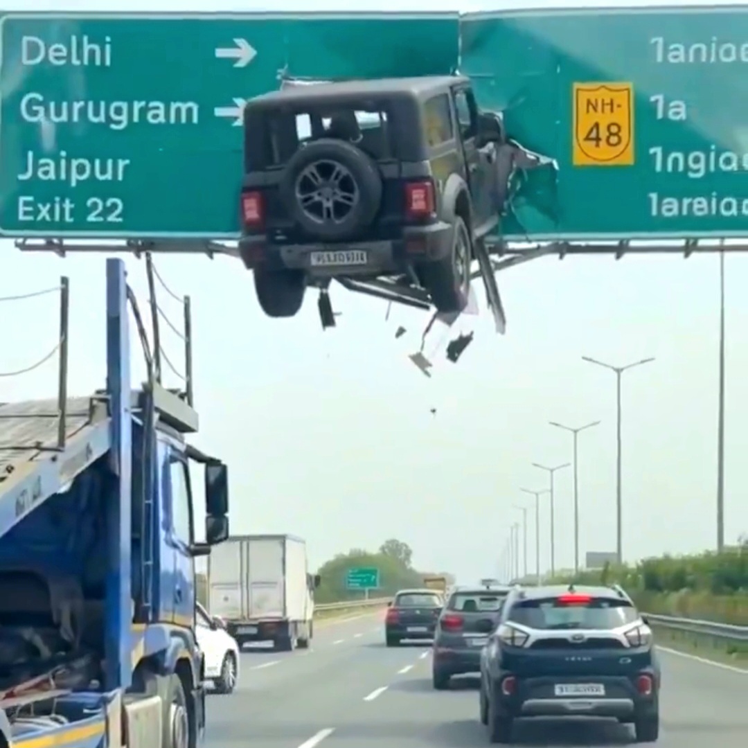 सड़क पर रफ़्तार, हवा में थार: साइनबोर्ड चीरते हुए बीच में जा फंसी गाड़ी